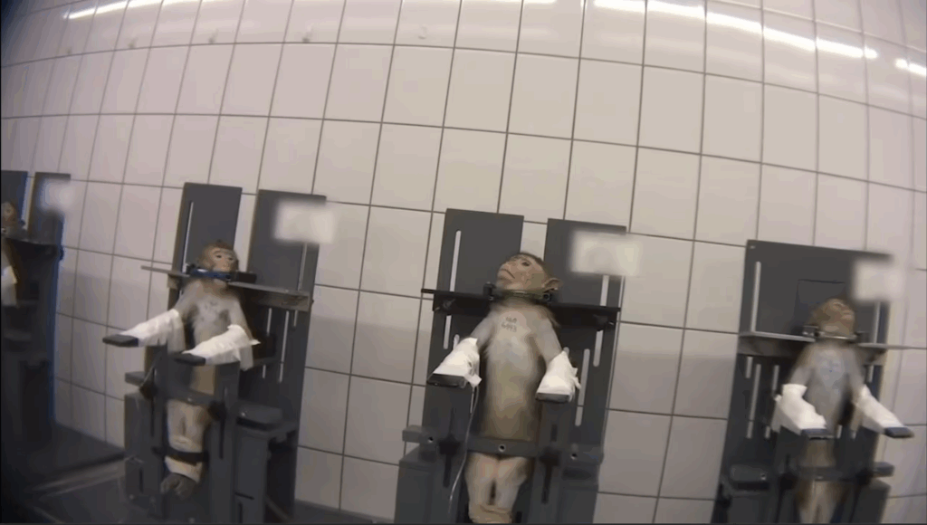 Bilden är tagen på ett tyskt djurförsökslaboratorium av Soko Tierschutz/Cruelty Free International. Anledningen till att vi använder den bilden är just för att KI inte tillåter någon fotografering av apförsöken.