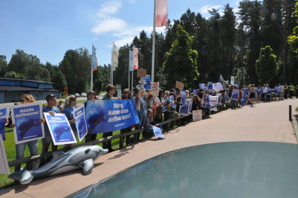 Djurrättsalliansen har under åren demonstrerat mot Kolmårdens delfinarium. Bilden är från 2014. År 2022 kom det efterlängtade beskedet att delfinariet ska stängas, men än så länge är delfinerna kvar och tvingas uppträda för publik.