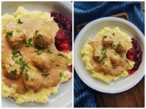 Smält mjölkfritt smör i en kastrull. Vispa ner vetemjöl. Tillsätt sedan havregrädde och vispa så att det inte blir några klumpar. Häll i vatten och grönsaksbuljong och låt koka upp. Smaka av med soja, peppar och ytterligare salt om det behövs. Servera med lingonsylt.